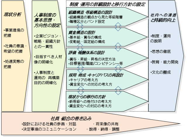 退職金制度の再構築は競争力向上に資するものでなければならず、そのためには、人事制度の中における報酬制度のあるべき姿を明らかにし、こ れと整合性のとれた報酬制度の一形態である退職金制度の思想を構築した上で、財務面、法律等の制約を踏まえた解決を行わなければなりません。