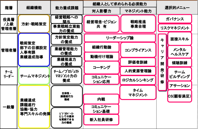 複合型研修:管理職・リーダーの意識改革 コミュニケーションスキル、マネジメントスキルなどの研修とリンクさせ相乗効果。